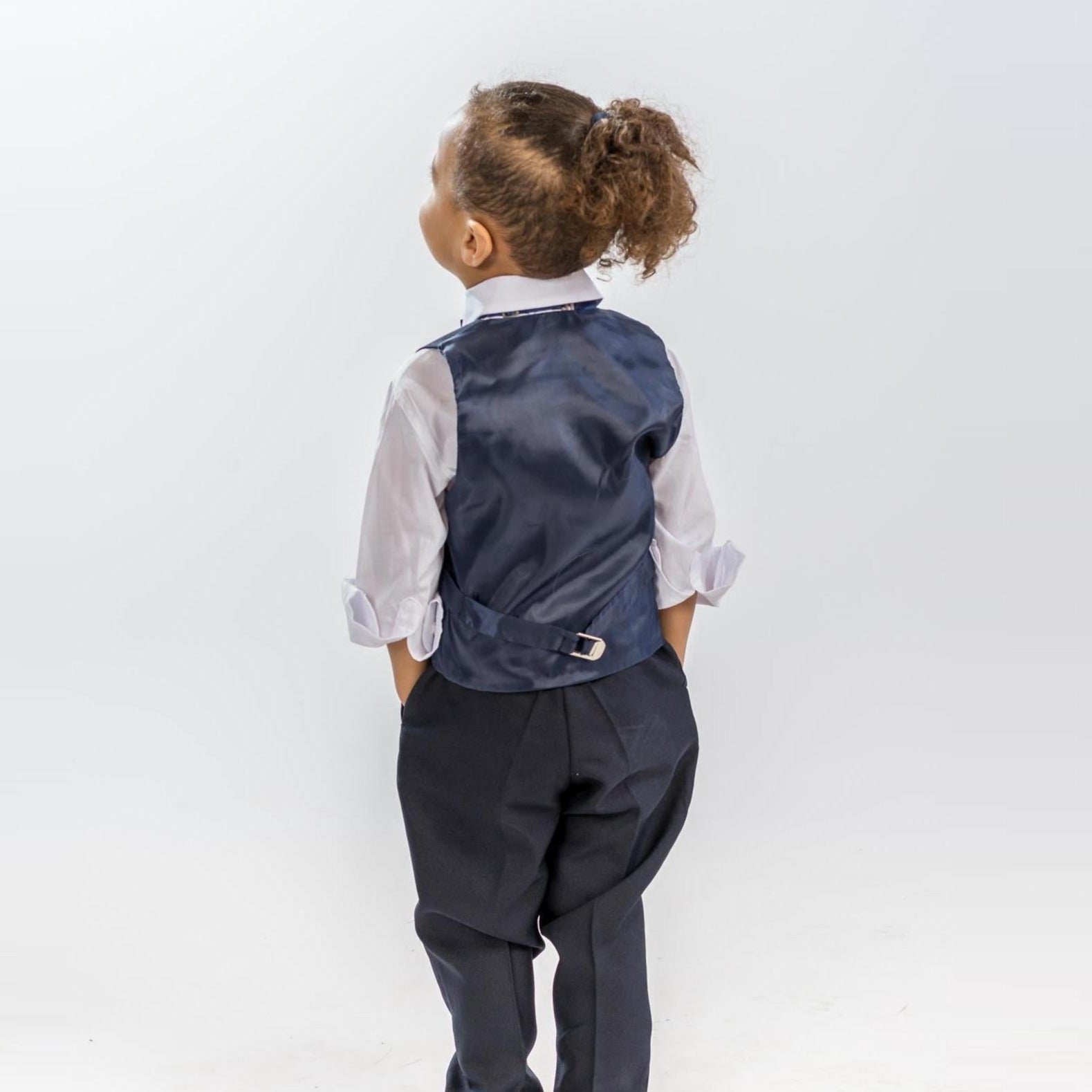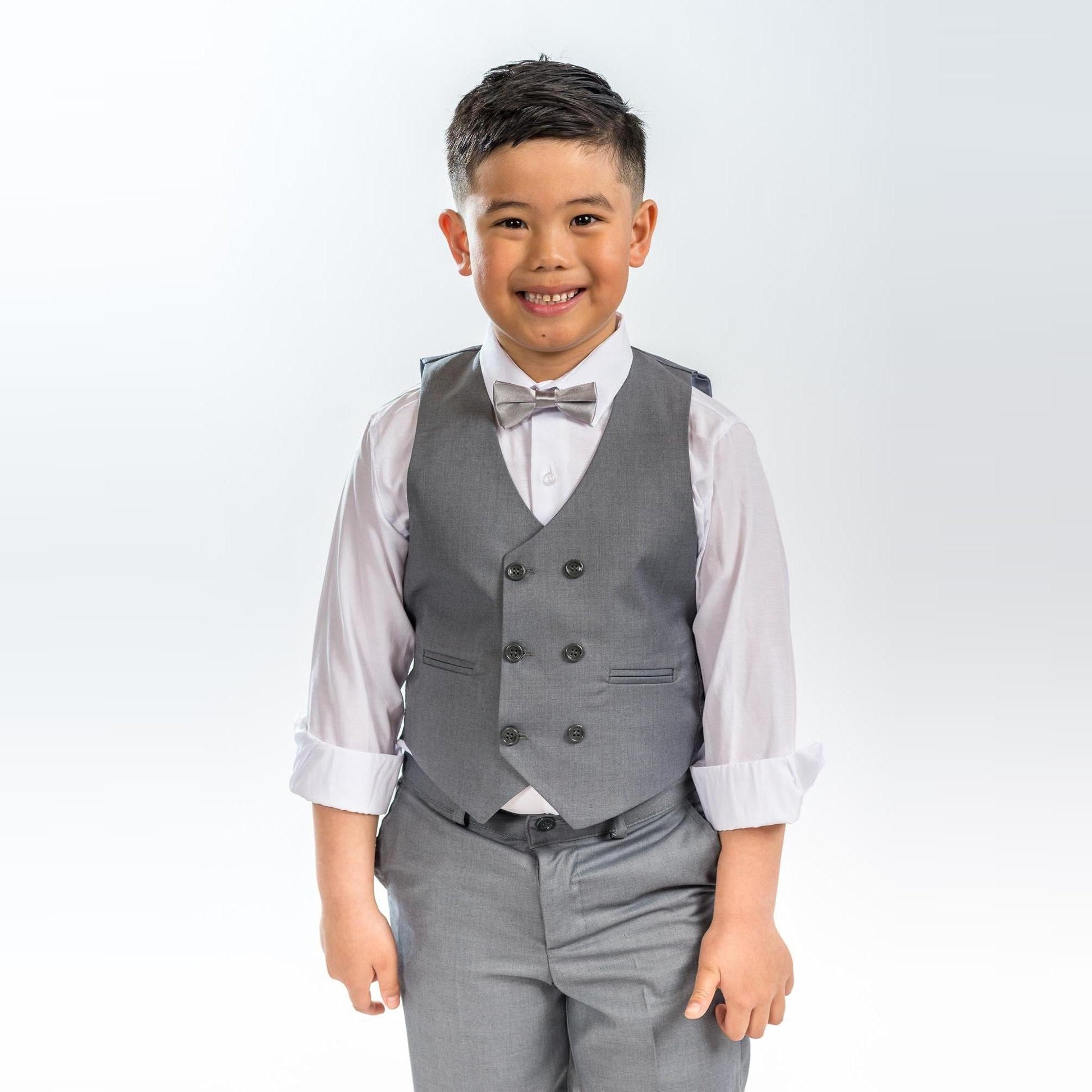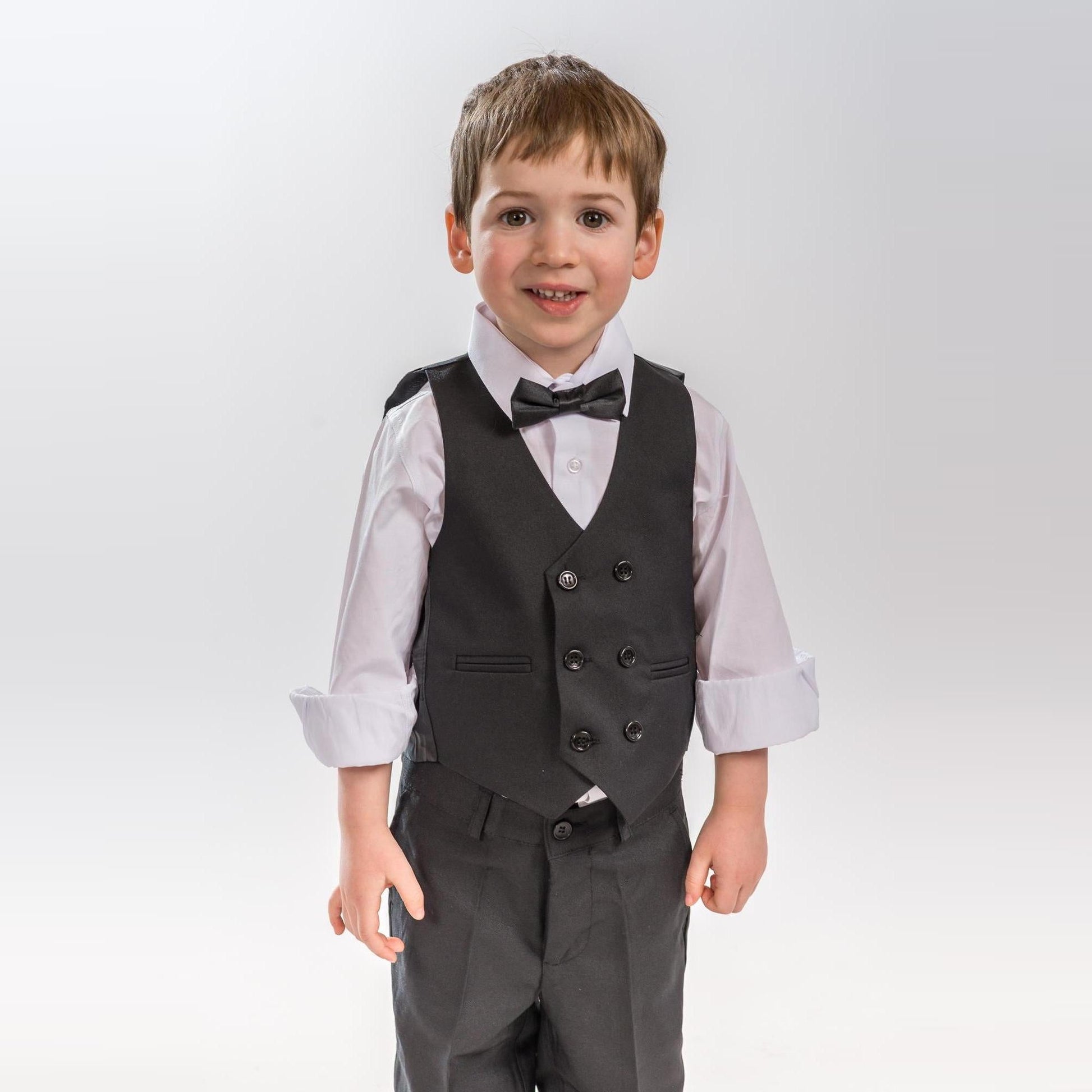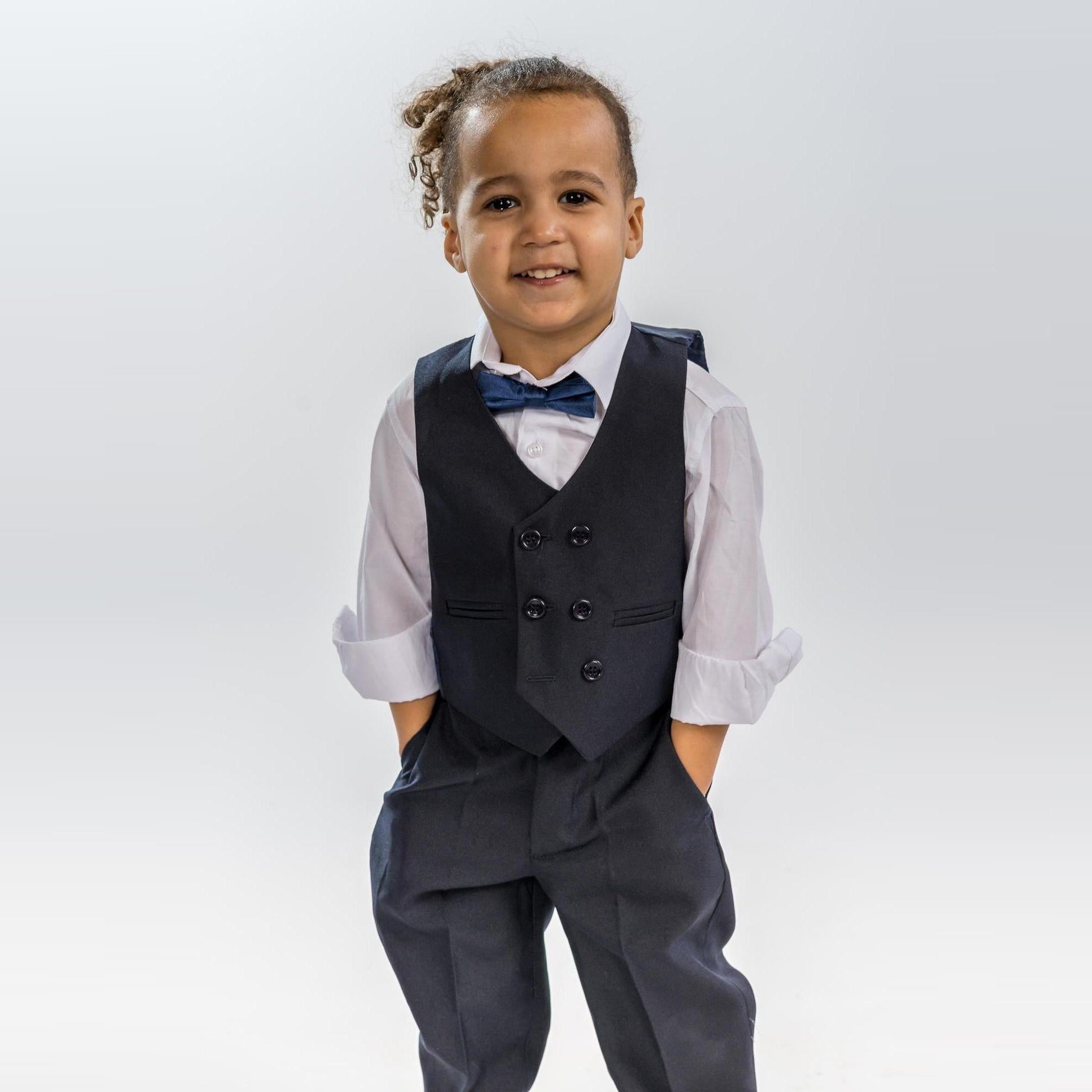Un style très européen et un look exclusif JuniorKids, ce superbe ensemble slim-fit comprend un gilet a 6 boutons (70% Polyester / 30% Viscose), un pantalon slim (70% Polyester / 30% Viscose) a taille ajustable, une chemise skinny (95% coton / 5% lycra) et nœud papillon en satin.